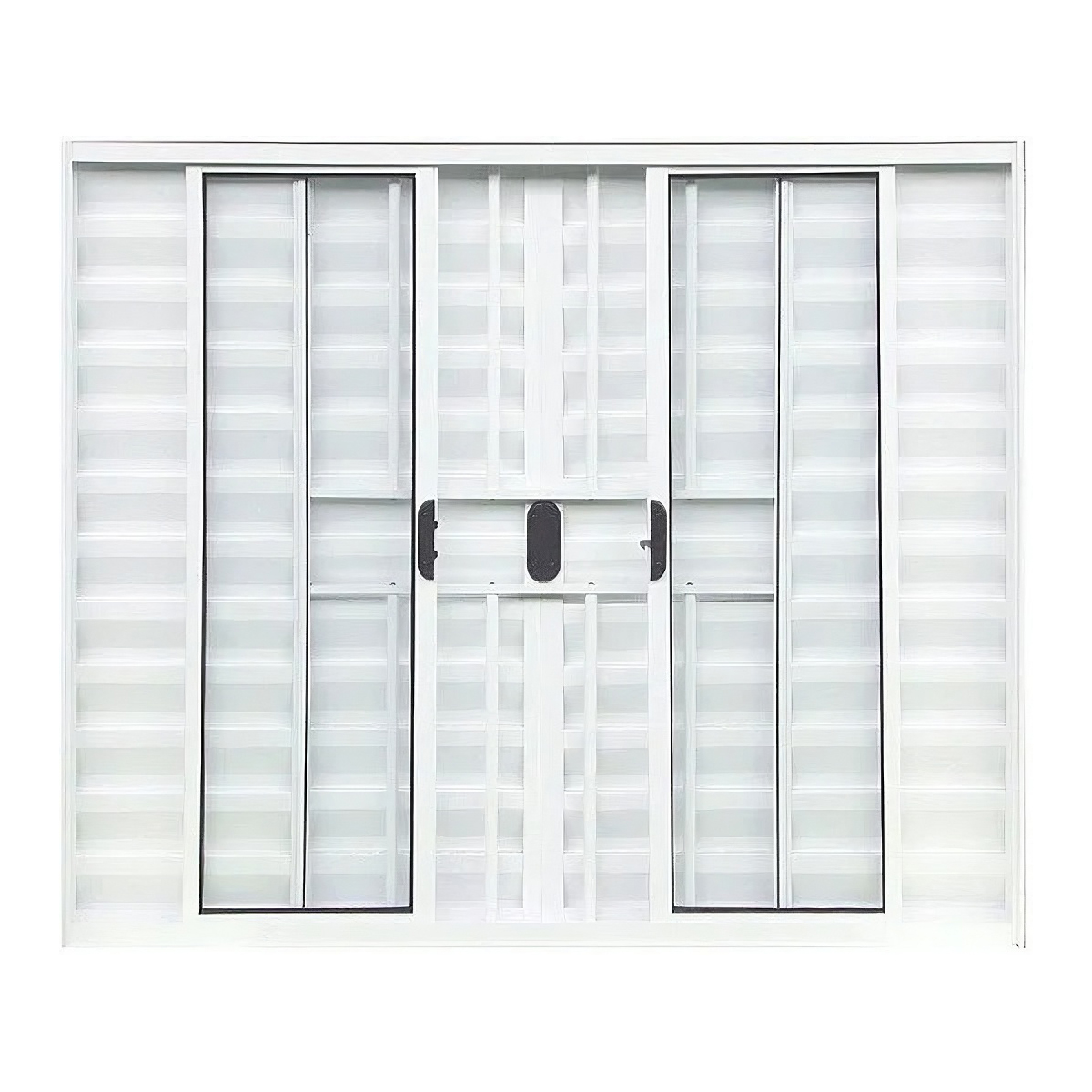 Veneziana de correr com 6 folhas e grade de proteção, unindo privacidade, ventilação e segurança.